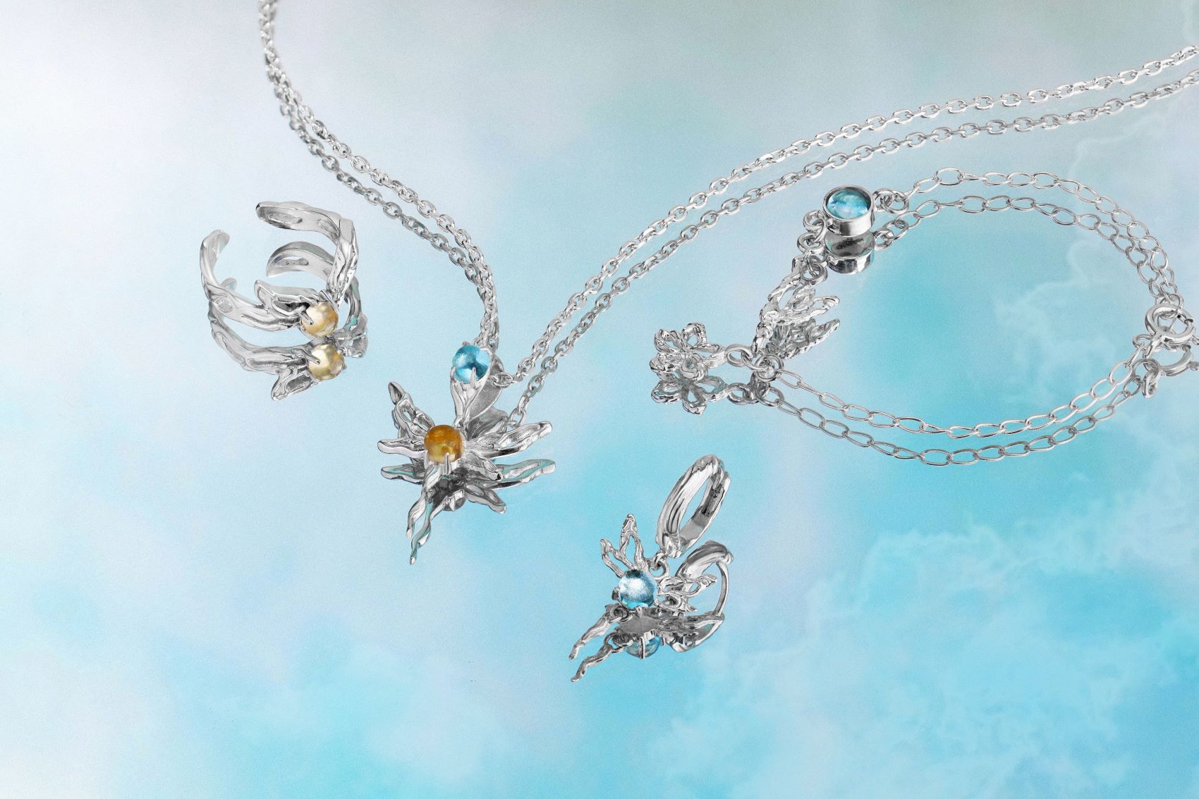 Điểm nhấn tinh thần của BST InBloom không chỉ nằm ở tạo hình cánh bướm hay chuồn chuồn, mà còn hiện diện trong chính hai loại đá tự nhiên được lựa chọn làm trái tim của từng thiết kế: Topaz xanh và Citrine vàng.