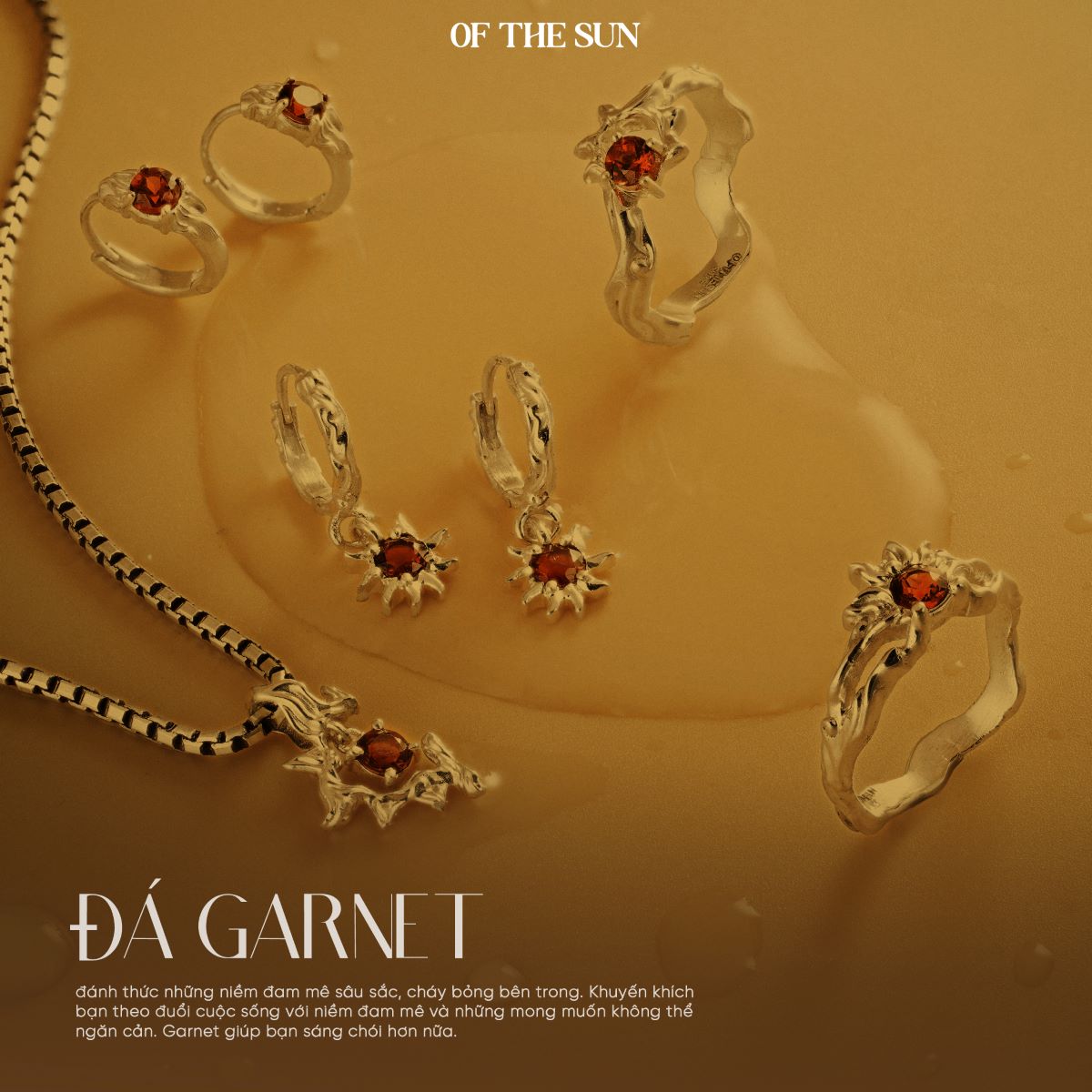 Trong Sun Collection, đá garnet được lựa chọn làm điểm nhấn chủ đạo – không chỉ bởi sắc đỏ sâu lắng và cuốn hút, mà còn bởi ý nghĩa biểu tượng mạnh mẽ mà nó mang theo. Garnet đại diện cho nguồn năng lượng sống dồi dào, cho đam mê, sự can đảm và một trái tim luôn rực cháy từ bên trong.