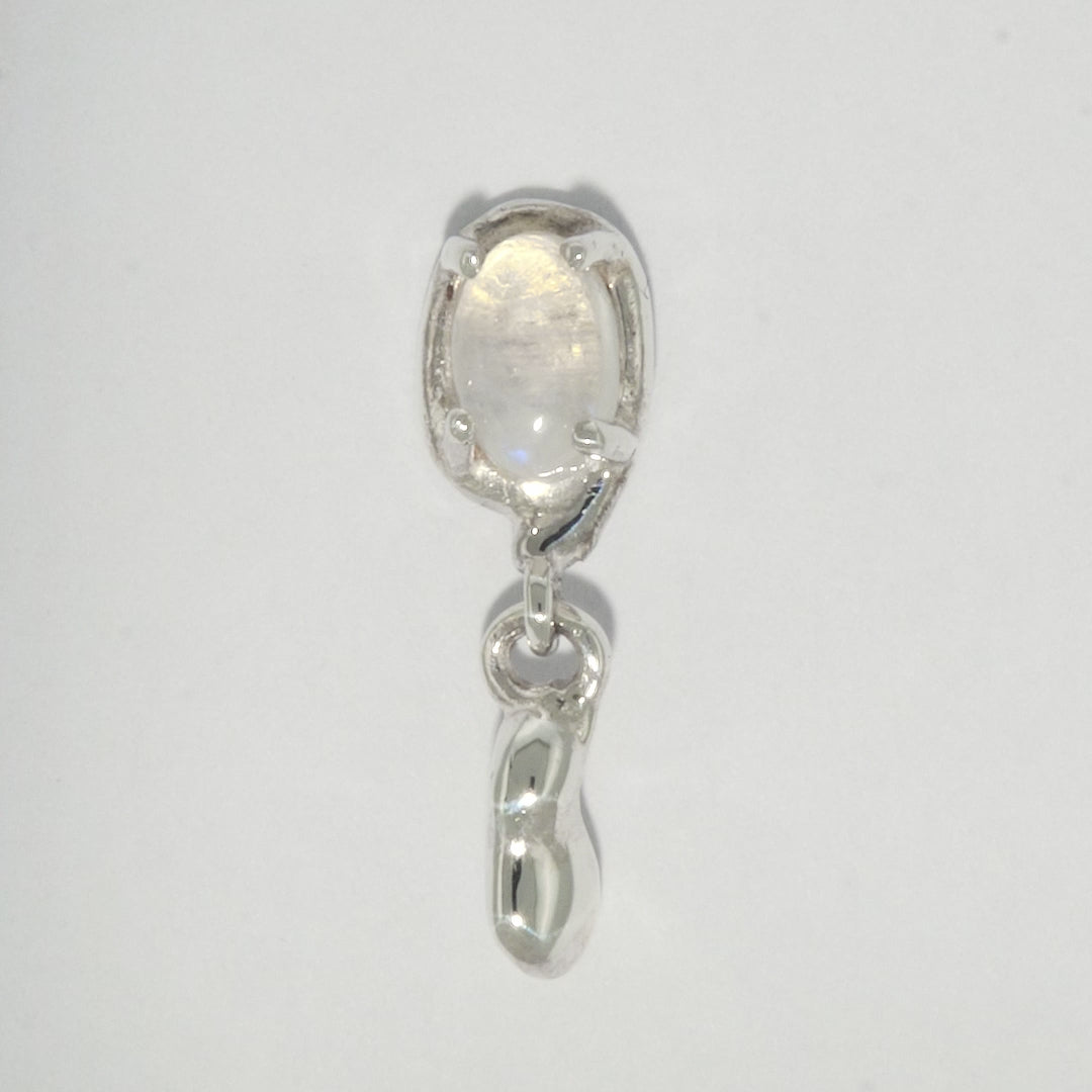 Phần chính của khuyên là viên đá Moonstone dạng oval được đính gọn gàng trong móc bạc mềm, tôn lên ánh ngũ sắc nhẹ nhàng của đá dưới ánh sáng – khi xanh mờ, khi ánh tím, khi lại trong suốt như một giọt sương sớm.