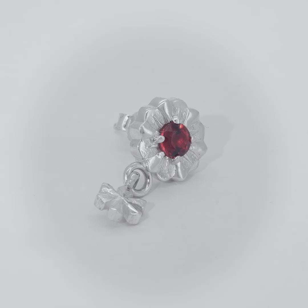 Tại trung tâm của mỗi bông tuyết là một viên đá Garnet màu đỏ thẫm, biểu tượng cho sự ấm áp và sức sống mãnh liệt ngay cả trong giá lạnh. Màu đỏ của Garnet tương phản nổi bật với vẻ sáng bạc của bạc, làm nổi bật sự tinh tế và quyến rũ của đôi bông tai.