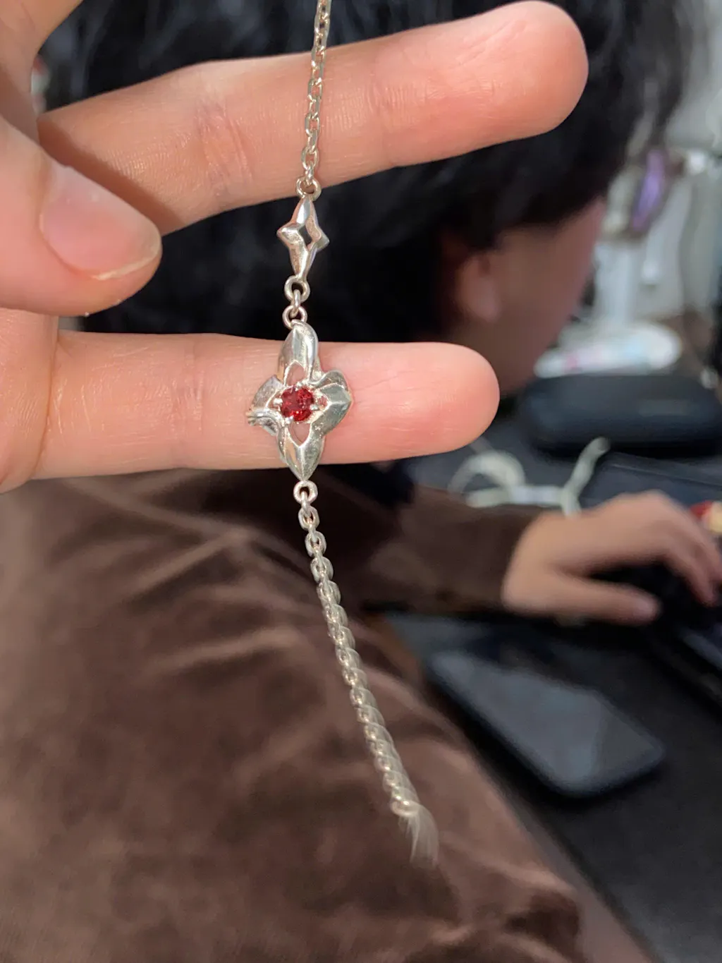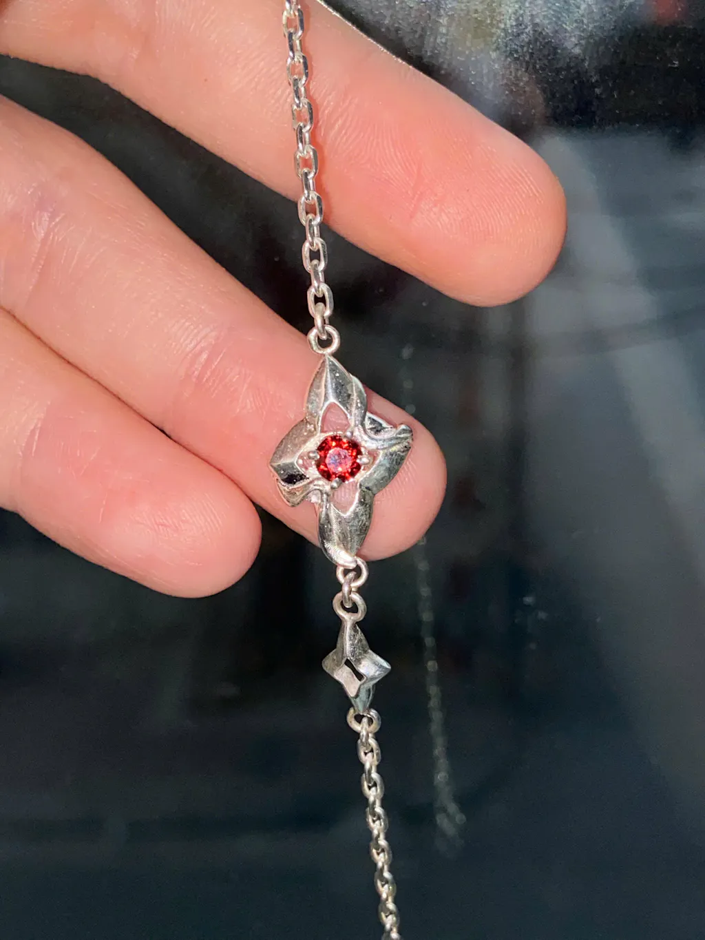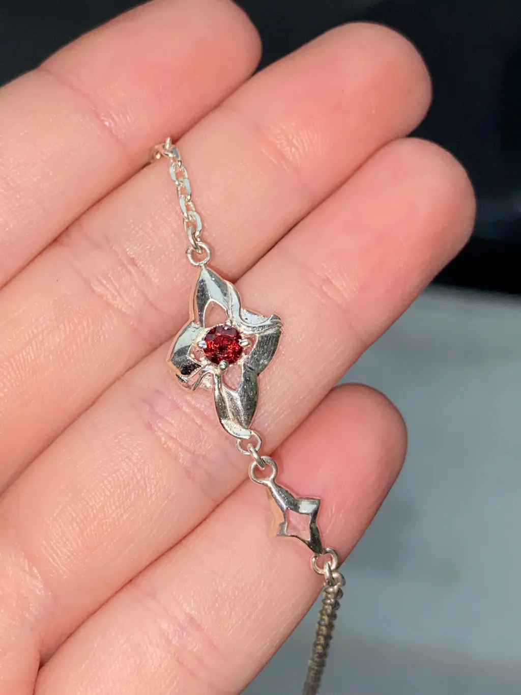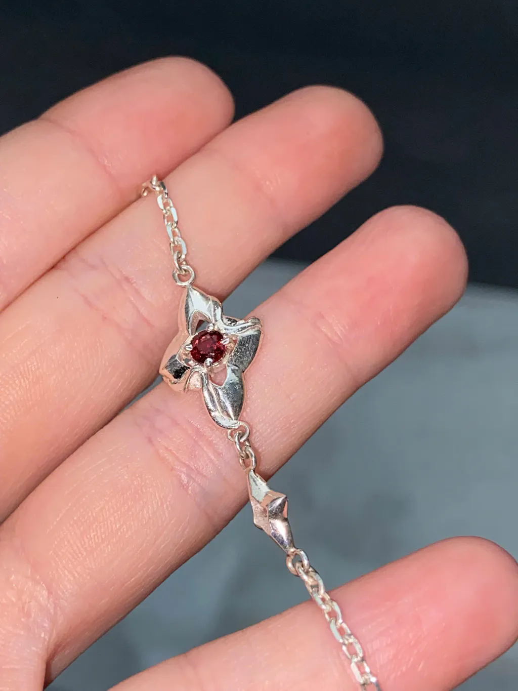 Tại trung tâm của mỗi ngôi sao là một viên đá Garnet đỏ thẫm, biểu tượng cho niềm đam mê và sức mạnh, phát sáng như những ngọn lửa nhỏ trong đêm đông giá lạnh. Viên đá Garnet không chỉ mang lại điểm nhấn màu sắc ấn tượng mà còn tô điểm thêm vẻ quyến rũ cho chiếc vòng tay.