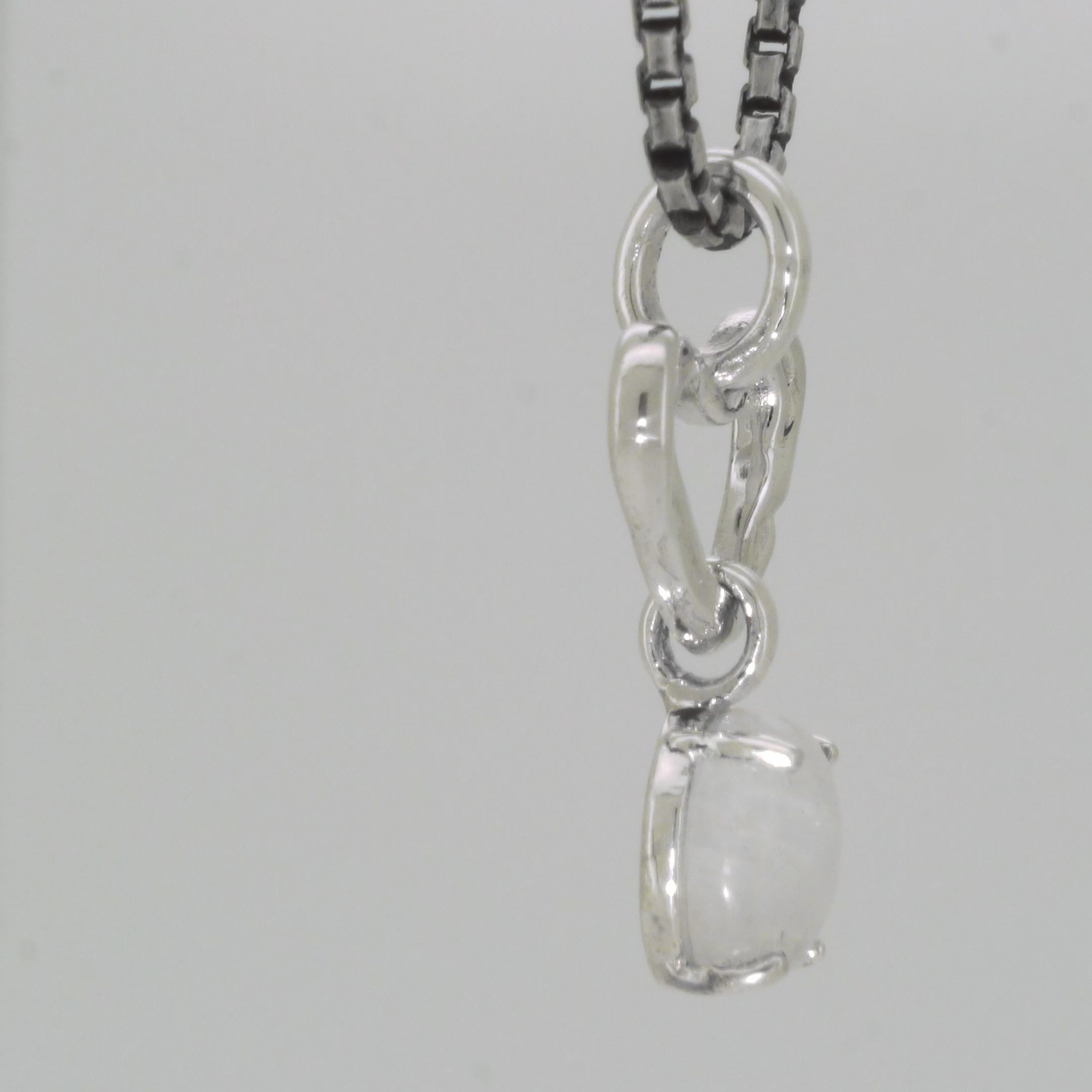 Viên Moonstone dáng oval được giữ bằng móc bạc tối giản, lơ lửng nhẹ nhàng bên dưới như một điểm sáng dịu êm, tạo nên sự cân bằng tinh tế giữa khoảng trống và điểm nhấn.