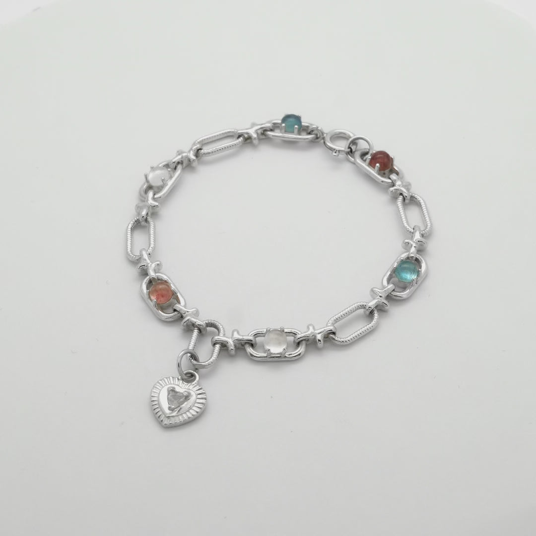 Lấy cảm hứng từ sự nối liền của thời gian, Mirada Loop được tạo nên từ những mắt xích chữ nhật uốn mềm, lồng ghép tinh tế để tạo nên nhịp điệu chuyển động không ngừng. Trên mỗi mắt xích, ba sắc đá tự nhiên Tourmaline hồng, Moonstone và Topaz xanh dương đan xen – như những cung bậc cảm xúc khác nhau của cuộc sống. Bề mặt bạc S925 được hoàn thiện mờ – bóng tương phản, vừa giữ nét rustic, vừa mang tinh thần hiện đại và tinh tế. Tâm điểm của vòng là charm trái tim Moonstone, biểu tượng cho nhịp đập yêu thương trong dòng chảy vô tận ấy. Mirada Loop không chỉ là một thiết kế trang sức, mà là câu chuyện về sự gắn kết, thời gian và tình yêu – dịu dàng, bền bỉ và vĩnh cửu. ✨