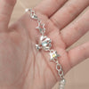 Tâm điểm của thiết kế nằm ở phần mặt dây bạc S925 tạo hình vỏ sò đang mở, đón lấy hai viên đá quý: Aquamarine xanh dịu như làn nước sâu lắng và Opal trắng ánh sắc chuyển động – như ánh sáng nhảy múa dưới mặt biển.