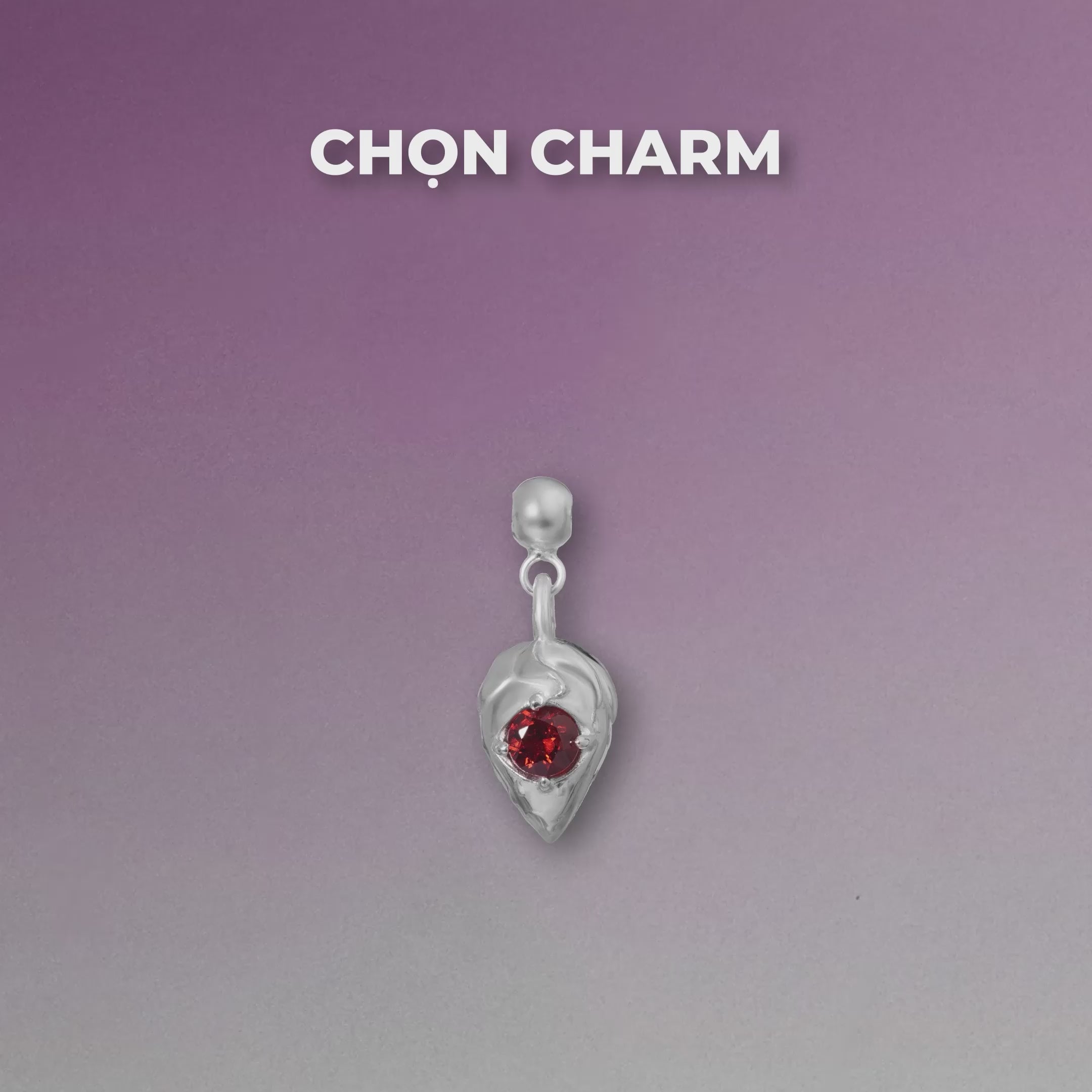 Tâm điểm của charm là viên Garnet – viên đá đỏ sẫm mang năng lượng ấm áp của mặt trời, tượng trưng cho ngọn lửa đam mê và sức sống. Khi ánh sáng chạm vào, bề mặt đá phản chiếu sắc đỏ sâu, như ánh dương len qua tán lá – rực rỡ nhưng không chói chang.