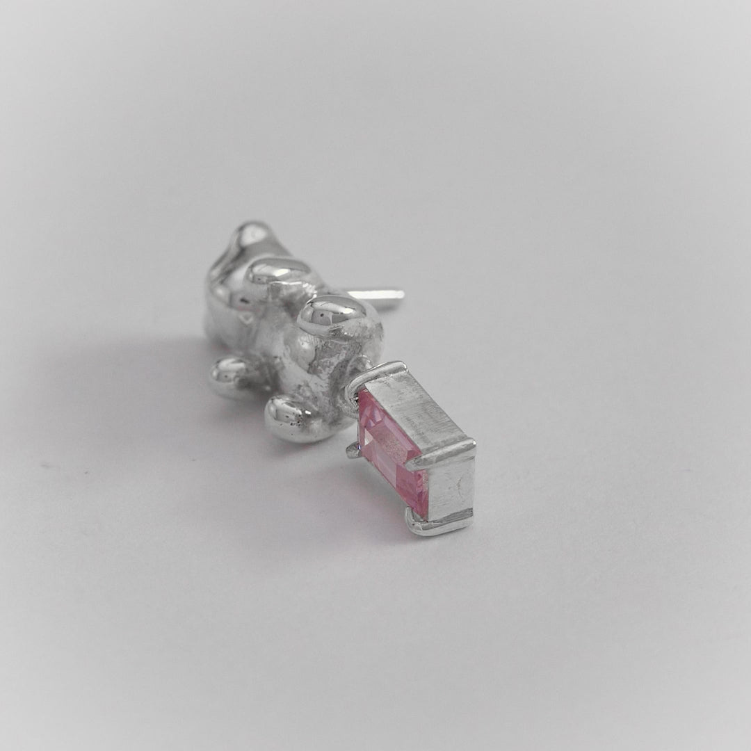 Chiếc khuyên tai "TeddyB" này là sự pha trộn giữa vẻ ngộ nghĩnh và thanh lịch. Mặt khuyên được thiết kế dưới hình dạng chú gấu Teddy, mang đến vẻ đáng yêu và ngây thơ. Từ chú gấu này, một viên đá CZ màu hồng dài lấp lánh được thả xuống, tạo thành điểm nhấn nổi bật và thu hút ánh nhìn.